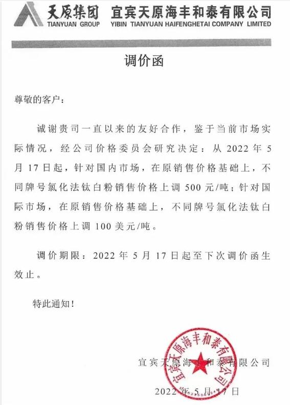 近日,天原集團發布調價函,稱5月17日起,針對國內市場,不同牌號氯化法鈦白粉銷售價格上調500元/噸,國際市場上調100美元/噸。