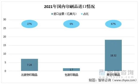 資料來源:中國印刷及設備器材工業協會、智研咨詢整理 2021年國內印刷品進口27.27億美元。其中,出版物印刷品進口7.24億美元、包裝印刷品進口1.70億美元、商業印刷品進口18.32億美元。出版物印刷品、包裝印刷品和商業印刷品進口占國內印刷品進口總金額的比重分別為27%、6%和67%。 2021年國內印刷品進口情況