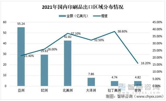 資料來源:中國印刷及設備器材工業協會、智研咨詢整理 2021年國內印刷品出口在全球各大區域市場的分布情況為,亞洲55.24億美元(同比增長21.4%)、歐洲29.61億美元(同比增長26.0%)、北美洲42.82億美元(同比增長37.1%)、大洋洲7.86億美元(同比增長32.5%)、拉丁美洲4.74億美元(同比增長38.6%)、非洲4.82億美元(同比增長16.2%)。出口到各大洲的印刷品占國內印刷品出口總值的比重為,亞洲38%、歐洲20%、北美洲30%、大洋洲5%、拉丁美洲3%、非洲3%。 2021年國內印刷品出口區域分布情況