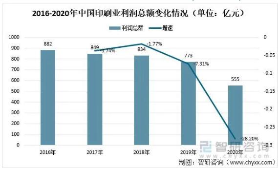 資料來源:國家新聞出版署、智研咨詢整理 2020 年,全國印刷復制(包括出版物印刷、包裝裝潢印刷、其他印刷品印刷、專項印刷、印刷物資供銷和復制)利潤總額為555億元,同比2019年下降28.20%。 2016-2020年中國印刷業利潤總額變化情況(單位:億元)