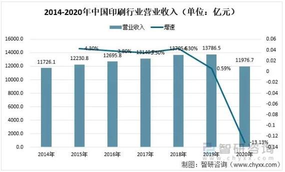 一、現狀 印刷業是一個巨大的行業體系,同時也是一個歷史悠久的行業體系。從中國古代的印刷術發明以來,印刷技術就一步步深入生產、生活,并一步步壯大、發展,形成一整個大的工業。 2020年受新冠肺炎疫情影響,中國印刷行業營業收入有所下滑,2020年中國印刷行業營業收入為11976.67億元,較2019年減少了1809.78億元,同比減少13.13%。其中,出版物印刷營業收入為1557.43億元,包裝裝潢印刷營業收入為9503.31億元,其他印刷品印刷營業收入為782.76億元。 2014-2020年中國印刷行業營業收入(單位:億元)