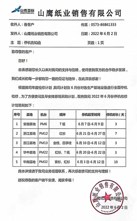 六月份的紙業市場依舊在低迷的行情中徘徊,先是玖龍限期優惠,后是山鷹停機減產。6月2日,山鷹國際旗下山鷹紙業銷售有限公司發布停機告知函,宣布根據年度檢修計劃,在6月將對各生產基地設備進行全面停機檢修,共涉及安徽、浙江、湖北及福建4大基地的5臺紙機,涉及的紙種有金桂、四季桂、紫杉、紅杉、T紙,預估停機檢修合計減少產量約2.2萬噸。