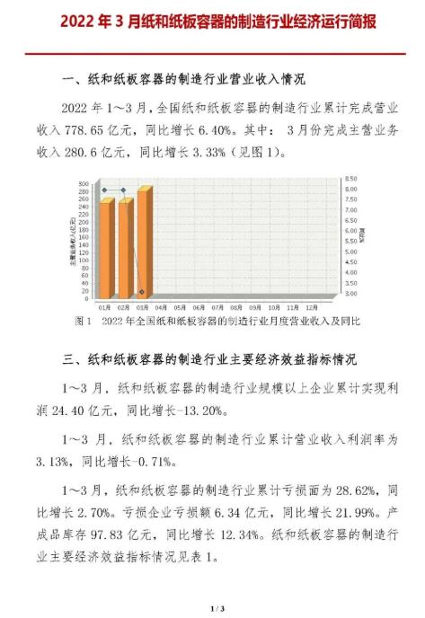 日前,中國包裝聯合會公布了《2022年一季度紙和紙板容器行業經濟運行簡報》。2022年1-3月,全國紙和紙板容器制造行業累計完成營業收入778.65億元,同比增長6.40%。