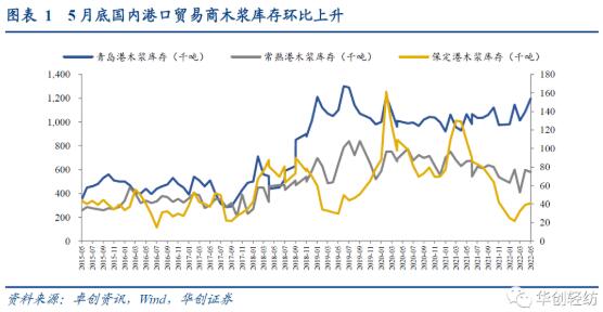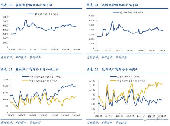報告摘要 木漿內盤價格保持高位震蕩,針葉漿、闊葉漿內外盤價差擴大。截至2022年5月底,青島港、保定港和常熟港木漿庫存分別上升10.9萬噸、上升0.2萬噸、下降1.7萬噸至119.6萬噸、4.1萬噸和58萬噸,環比分別+10.03% / +5.13% / -2.85%。5月針葉漿外盤平均價格為1006.11美元/噸,折合人民幣6390.85元,月環比上升0.34%,同比上升0.90%;5月闊葉漿外盤平均價格為753美元/噸,折合人民幣4783.08元,月環比上升2.05%,月同比下降3.11%。 5月國內廢紙價格環比上升,紙廠黃板紙庫存上升。價格方面:國內廢黃板紙標桿均價為2350元/噸,環比上升0.43%,同比上升4.26%,形成成本端支撐;庫存方面:1月起庫存持續上升至峰點開始回落,至4月滑落至接近最低水平,5月庫存小幅提升至7天,環比增加1天。 物流回溫,包裝紙開工率提升。受疫情影響,下游家電、飲料需求低迷,5月箱板紙、瓦楞紙價格略有下降,5月下旬疫情漸好,物流恢復有望帶動需求回升,5月開工情況明顯改善,箱板紙、瓦楞紙開工率分別環比上漲9.87%,7.24%;庫存方面,訂單成交情況一般,去庫壓力仍存。進出口方面,4月瓦楞紙進口量環比下降8%,箱板紙4月進口環比下降14%。 未來展望:供應端壓力顯著,維持漿價高位橫盤的判斷。木漿價格受全球供應不足、物流受限、能源價格上漲的影響居高不下。頭部紙企采用外盤直采,成本端壓力相對較小,預計盈利情況優于行業水平。部分紙企停工維修,市場集中度預計略有提升。另外各國對中國木漿供應增加,國內木漿庫存增加,疊加國內成本壓力下開工率下滑,短期或壓制漿價上行,但在全球供給縮減背景下,暫未觀察到漿價明顯的下行驅動。預計Q2、Q3紙企成本進入高峰期。紙價方面:紙企為將部分成本端壓力傳遞給下游客戶,挺價意愿較強,但國內市場需求低迷,觀望氣氛較濃,漲價函落地有待觀察,具體將看疫情后需求回升程度以及物流恢復情況。包裝紙方面:疫情期間整體需求萎縮,5-6月隨著各地恢復正常狀態,需求預計走向恢復。目前開工率顯著提升。 重點推薦個股:紙漿自供具有成本優勢,高端箱板帶動利潤增長的【太陽紙業】。外廢漿布局良好,回收造紙包裝一體化、供應鏈降本增效的【山鷹國際】。產能穩步釋放,高毛利產品占比持續提升的【仙鶴股份】【五洲特紙】。白卡產能釋放,市占率穩步提升,定價能力有望增強的【博匯紙業】。 風險提示:宏觀經濟下行致需求大幅下滑;成本端壓力難以傳導。 5月紙產業鏈庫存數據出爐,木漿系、廢紙系略顯疲態 木漿系產業鏈:國際事件擾動影響尚存,紙漿供給存縮減預期,價格基本維持高位震蕩。5月木漿價格環比上升,港口庫存環比上升,需求一般,紙企上游成本壓力上行。文化紙市場繼續低迷,雙膠紙、銅版紙價格環比下降,毛利仍有下探空間。出口局部松動,銅版紙對外出口環比下降,白卡紙出口較穩,一定程度釋放庫存壓力,鑒于國內市場觀望氣氛較濃,下游需求一般,去庫壓力仍存。 廢紙系產業鏈:國廢價格2月下降,于3月開始回升,5月基本維持小幅上升趨勢,庫存環比上升。5月疫情封鎖逐漸解除,物流恢復,企業開工率有所上升。紙價受下游家電、飲料需求低迷影響小幅下降,同時箱板、瓦楞紙進口量略有下降。 (一)木漿內盤價格保持高位震蕩,針葉漿、闊葉漿內外盤價差略有擴大 國際事件影響尚存:芬蘭紙企工人罷工持續至4月、俄烏沖突導致歐洲、俄羅斯紙漿產業鏈上端(原木、木片等)供應阻塞,雙方生產受限,同時沖突帶動能源成本上升、國際物流疲軟,一系列事件將繼續推動國際紙漿存供應縮減預期,對紙漿價格形成支撐;同時,芬寶宣布旗下AKI漿廠暫時停產,預計6月對中國減少50%的供應,木漿內盤價格利多影響顯著。但是,木漿價格上漲幅度有限,一方面是短期由于俄烏沖突迫使俄歐現有木漿產品部分出口中國,4月中國從俄羅斯進口的針葉漿連續兩月維持歷史高位水平,疊加加拿大6月恢復供應,一定程度緩解供應壓力,對木漿內盤價格抬升起到一定壓制作用,另一方面,國內紙企成本端壓力難以釋放,企業盈利承壓,下游市場需求持續低迷,對于木漿價格形成一定利空影響。總體觀之,利空利多消息并存,但基于基本面分析,我們認為在宏觀供需問題并未得到解決的情況下,木漿價格將繼續保持高位震蕩,具體可觀國際供應、國際物流何時恢復,以及疫情漸好后國內下游市場消費復蘇情況。 國內港口貿易商木漿庫存環比上升。截至2022年5月底,青島港、保定港和常熟港木漿庫存分別上升10.9萬噸、上升0.2萬噸、下降1.7萬噸至119.6萬噸、4.1萬噸和58萬噸,環比分別+10.03% / +5.13% / -2.85%。三個港口合計庫存181.7萬噸,較4月底增加9.4萬噸,港口庫存增加。5月港口木漿依然位于近3年的高位水平,去庫需求仍在。