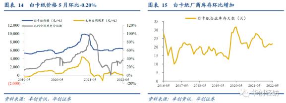 5月針葉漿、闊葉漿內外盤價格攀至接近5年最高位,內外盤價差擴大,成本端壓力顯著。5月針葉漿外盤平均價格為1006.11美元/噸,折合人民幣6390.85元,月環比上升0.34%,同比上升0.90%;內盤平均價格為7373.09元/噸,月環比上升3.56%,月同比上升6.27%;5月國內外平均價差上升至982.24元/噸,月環比上升32.79%,月同比上升84.25%。5月闊葉漿進口環比下降,供應略顯不足,將對針葉漿價格形成支撐。 5月闊葉漿外盤平均價格為753.00美元/噸,折合人民幣4783.08元,月環比上升2.05%,月同比下降3.11%;內盤平均價格為6492.4元/噸,月環比上升7.69%,月同比上升26.13%;5月國內外平均價差上升至1709.32元/噸,月環比上升28.09%,月同比上升998.04%。 白卡紙需求內縮外穩;紙價小幅下降,庫存環比上漲。5月白卡紙平均價格為6420.5元/噸,環比下降0.20%,同比下降31.10%;需求端,出口訂單較穩,一定程度可對沖國內下游需求收縮。由于出口增長空間有限,整體企業庫存呈現增加趨勢,截至5月底,白卡紙企業庫存天數21.95天,較4月增加0.61天;企業庫存為69.94萬噸,環比上漲1.96萬噸,同比下降14.49萬噸。當前白卡紙的毛利空間已處于歷史較低。白板紙5月企業庫存環比上漲10.8%,庫存天數在24天左右,下游需求低迷,經銷商備貨心態謹慎。