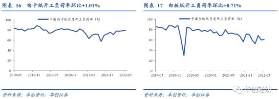 白卡紙開工負荷率逐漸恢復到正常水平,白板紙復工仍存問題。5月疫情漸好,下游白卡紙消費量有望回升,相應5月白卡紙開工率提升1.01個百分點,基本維持4月的上漲趨勢。白卡紙生產走向正常化,5月白卡紙產量同比增加38.82%。5月白板紙開工率略有回調,上漲0.71個百分點,但生產仍處于低迷狀態。
