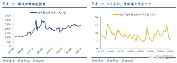 (二)5月國內廢紙價格環比上升,紙廠黃板紙庫存上升 5月廢紙價格、庫存環比小幅提升。廢黃板紙標桿均價為2350元/噸,環比上升0.38%,同比上升4.26%;22年1月庫存上升至峰點開始回落,至四月滑落接近于最低水平,2022年5月底廠商黃板紙庫存小幅上升,增加至7天,環比增加1天。