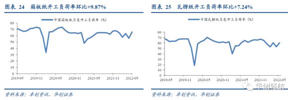 箱板紙、瓦楞紙開工負荷環比上漲。5月各地區物流因素影響逐漸降低,江蘇、浙江、重慶等地區企業開工率提升明顯。總體來看,箱板紙行業5月份開工負荷65.84%,較上月上漲9.87個百分點,較去年同期上升5.43pct。瓦楞紙5月份開工負荷60.46%,較上月上漲7.24pct,較去年下降0.77pct。
