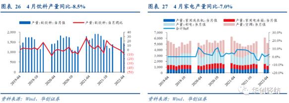 需求端,家電銷售、飲料產量同比下降。4月份四大家電產量累計5094.2萬臺,同比下降7.0%。4月份飲料產量為1410.1萬噸,同比下降8.5%。