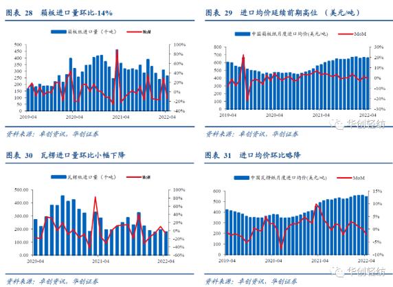 4月海內外包裝紙價差略有縮小,包裝紙進口量有所下降。箱板紙4月進口26.25萬噸,環比下降14%,瓦楞紙4月進口17.86萬噸,環比下降8%。