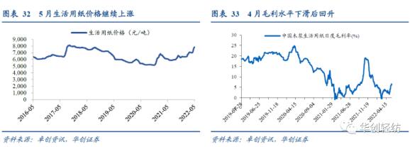 (四)生活用紙價格小幅上漲,毛利水平仍處于較低位置 5月生活用紙漲價函落實,價格小幅上漲推動毛利略有回升,但仍處低位;原材料價格方面,上游漿價維持高位,成本面存在一定支撐;行業去庫壓力仍然存在。 根據卓創數據,5月生活用紙市場均價為7480.0元/噸,月環比上升約463.8元/噸,同比去年提升1389.0元/噸,漲幅22.8%。公共衛生事件不穩定性仍存、上游漿價走勢、紙企生產負荷調整、淡旺季轉換等多方因素相互作用推動生活用紙價格小幅上漲。 由于漿價居高不下和紙價仍然低迷,4月噴漿木漿工藝大型紙企毛利率持續下降,至5月初達到最低點2.09%后開始回升,5月30日毛利率恢復至6.23%,但仍處于近年低位。