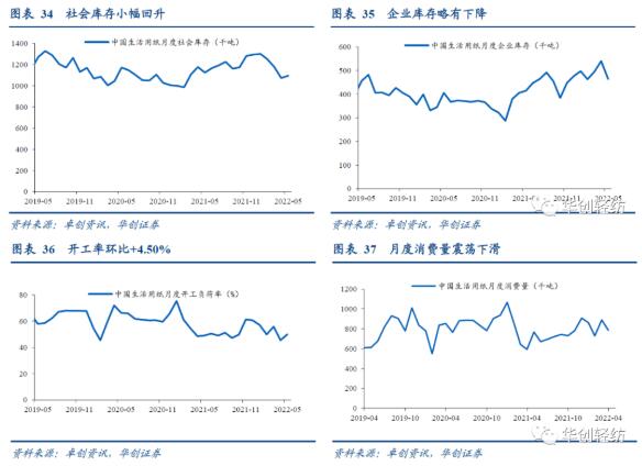 下游需求一般,企業去庫壓力仍存,開工率小幅提升。國際公共衛生事件的不穩定性依舊存在,疊加人口增長不及預期等均對生活用紙的需求增長產生一定制約,4月生活用紙消費量下降至78.54萬噸,環比下降11.8%,企業庫存略有下降,但仍處高位,紙企去庫壓力依然顯著。生活用紙5月開工率環比上漲4.50%,主要是受到第一,5月紙價明顯上漲,廠商生產積極性得以提升;第二,華東、華南地區少量新產能投放,略微帶動整體開工率的提升。