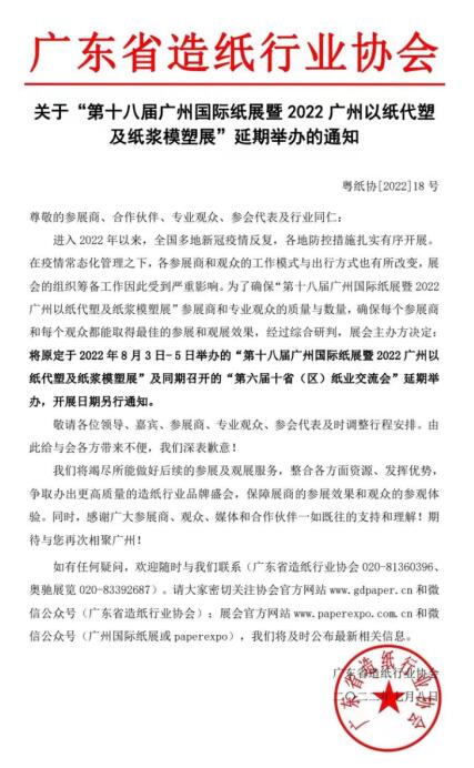 關于“第十八屆廣州國際紙展暨2022廣州以紙代塑及紙漿模塑展”延期舉辦通知