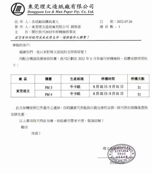 其中,廣東基地的箱板紙機(jī)PM52將從7月27日起停機(jī)7天,該臺(tái)紙機(jī)于今年5月份投產(chǎn),設(shè)計(jì)年產(chǎn)能超60萬噸;位于福建的華南基地共有4臺(tái)紙機(jī)將在8月份停機(jī),時(shí)長(zhǎng)為15-31天;華中、浙江、安徽基地各有1臺(tái)紙機(jī)計(jì)劃停機(jī),時(shí)長(zhǎng)為7-10天。 玖龍、山鷹均有停機(jī)計(jì)劃,同樣被稱為包裝紙行業(yè)龍頭的理文造紙自然亦是如此。同日,理文造紙旗下東莞理文宣布,因配合機(jī)器設(shè)備維修保養(yǎng),計(jì)劃在8月份對(duì)兩臺(tái)紙機(jī)停機(jī)檢修。 具體而言,東莞理文的PM3、PM4均將在8月2日-9月1日期間停機(jī)檢修,停機(jī)天數(shù)長(zhǎng)達(dá)31天。這兩臺(tái)紙機(jī)專門生產(chǎn)牛卡紙,若停機(jī)一個(gè)月,預(yù)計(jì)將影響產(chǎn)能超5萬噸。