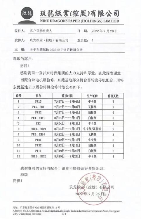隨著東莞玖龍宣布停機(jī)檢修,山鷹國(guó)際、東莞理文、東莞金洲等大批紙廠的停機(jī)公函也已露出水面。一場(chǎng)規(guī)模浩大的“停機(jī)潮”,正在華南地區(qū)逐步上演。 多家造紙巨頭發(fā)布停機(jī)計(jì)劃 7月26日,東莞玖龍紙業(yè)宣布,旗下14臺(tái)紙機(jī)將在7月27日-8月26日輪流停機(jī)減產(chǎn)。該消息一經(jīng)發(fā)出,便迅速傳遍整個(gè)造紙及包裝行業(yè)。