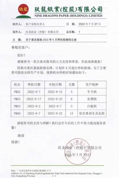 重慶玖龍 重慶玖龍在8月份共有4臺紙機進行停機檢修,時間為8月2日-8月17日,停機檢修期間將影響牛卡紙、瓦楞紙、白板紙的正常供應。其中,生產低克重再生及瓦楞紙的PM40停機時間最長,將自8月7日起停產15天。 據了解,重慶玖龍目前共有4臺紙機,總設計年產能為190萬噸。換而言之,8月份,重慶玖龍每臺紙機均將停機5-15天。