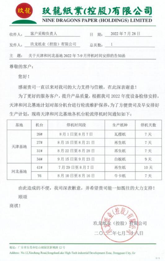 天津及河北玖龍 天津玖龍將有3臺紙機在8月份停產7天,分別為瓦楞紙機26#、再生紙機27#和31#。此外,白板紙機34#將在9月份停機檢修,時間為9月15日-9月23日,停機時長為9天。 河北玖龍共有兩臺紙機將停機檢修,其中再生紙機41#從7月29日起停機10天,牛卡紙機Y6在8月10日-8月16日期間停機7天。