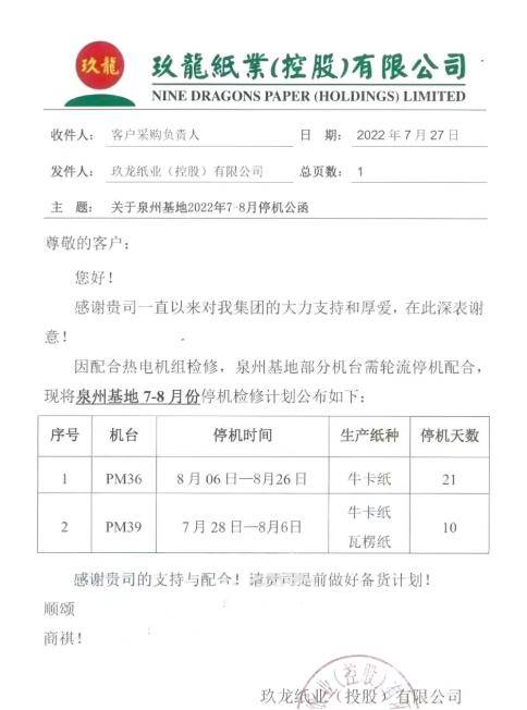 泉州玖龍 泉州玖龍的單臺紙機停機時間較長,其中生產牛卡紙的PM36將在8月6日-8月26日停機21天,生產牛卡和瓦楞的PM39從7月28日起停機,時長為10天。
