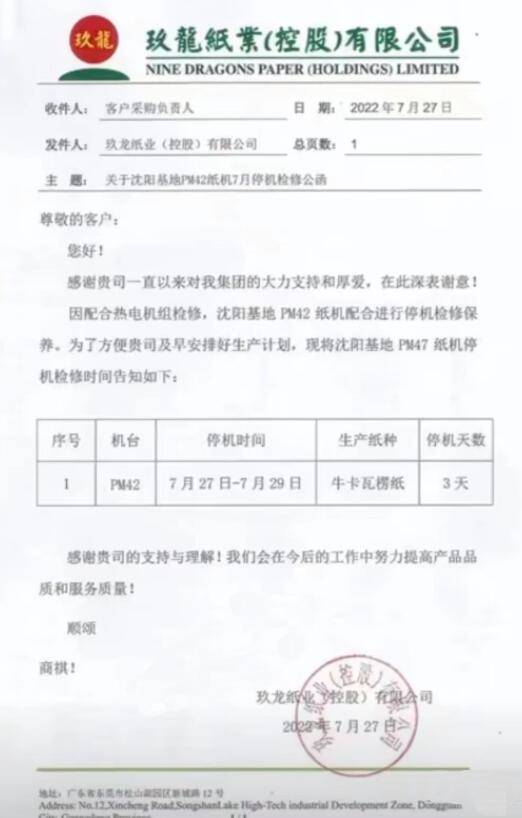 沈陽玖龍 沈陽玖龍目前共有2臺紙機,總計年產能為95萬噸,本次停機的是生產牛卡和瓦楞紙的PM42,從7月27日起停機3天。