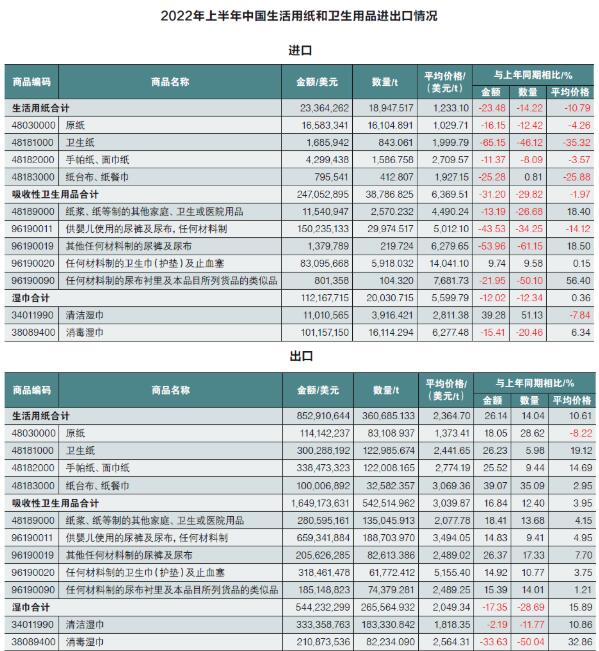 生活用紙 進口 與2021年大幅增長的形勢相反,2022年上半年生活用紙進口量和進口額都出現(xiàn)雙位數(shù)下降,進口量1.89萬t,不足2萬t,仍以原紙為主,占總進口量的85.0%。 出口 2022年上半年生活用紙出口形勢良好,一改2021年下半年以來下降的趨勢,出口量、出口額、出口平均價格都實現(xiàn)了雙位數(shù)的增長。出口產(chǎn)品仍以加工成品為主,占比77%。原紙和加工成品的出口量和出口額全部實現(xiàn)增長,且加工成品的出口平均價格也出現(xiàn)增長,出口產(chǎn)品的結(jié)構(gòu)繼續(xù)向高端化發(fā)展。 在經(jīng)歷了2020年上半年大幅上漲和2021年上半年顯著回落的波動后,2022年上半年生活用紙出口量基本恢復(fù)常態(tài),略高于2019年上半年的水平。 吸收性衛(wèi)生用品 進口 2022年上半年,吸收性衛(wèi)生用品進口量3.9萬t,比2021年同期下降29.82%,其中占比最大的嬰兒紙尿褲下降更多,達到34.25%;成人紙尿褲進口數(shù)量最小,只有219.7t,但同比下降61.15%,下降幅度最大;在吸收性衛(wèi)生用品中,衛(wèi)生巾(護墊)及止血塞是唯一實現(xiàn)增長的品類,進口量和進口額分別增長9.58%和9.74%。 進口量的下降,顯示國產(chǎn)吸收性衛(wèi)生用品已經(jīng)能夠滿足國內(nèi)市場需求。同時,數(shù)據(jù)顯示,成人失禁用品(海關(guān)編碼48189000,96190019和96190090)進口平均價格出現(xiàn)較大增長,說明進口的少量產(chǎn)品主要是高端產(chǎn)品的補充。 出口 2022年上半年,吸收性衛(wèi)生用品出口仍然保持全面增長勢頭,出口量、出口額和出口平均價格都延續(xù)了2021年同期的增長趨勢,分別增長12.40%、16.84%和3.95%。其中,嬰兒紙尿褲仍是占比最大的品類,約占34.8%,與2021年同期基本相當。 濕巾 進口 海關(guān)統(tǒng)計的濕巾分為清潔濕巾和消毒濕巾兩大類,我國的濕巾進出口貿(mào)易以出口為主,進口量不足出口量的1/10。 2022年上半年,濕巾總進口量和總進口額與2021年同期相比都出現(xiàn)兩位數(shù)下降,其中占比80%以上的消毒濕巾進口量和進口額分別下降20.46%和15.41%。 出口 與2021年同期相比,濕巾的出口量和出口額分別下降28.69%和17.35%,清潔濕巾和消毒濕巾也都呈現(xiàn)下降的趨勢。但出口平均價格都出現(xiàn)兩位數(shù)上漲,說明國產(chǎn)的濕巾產(chǎn)品在國際市場上有一定的話語權(quán)。出口產(chǎn)品以清潔濕巾為主,占比達到69%。
