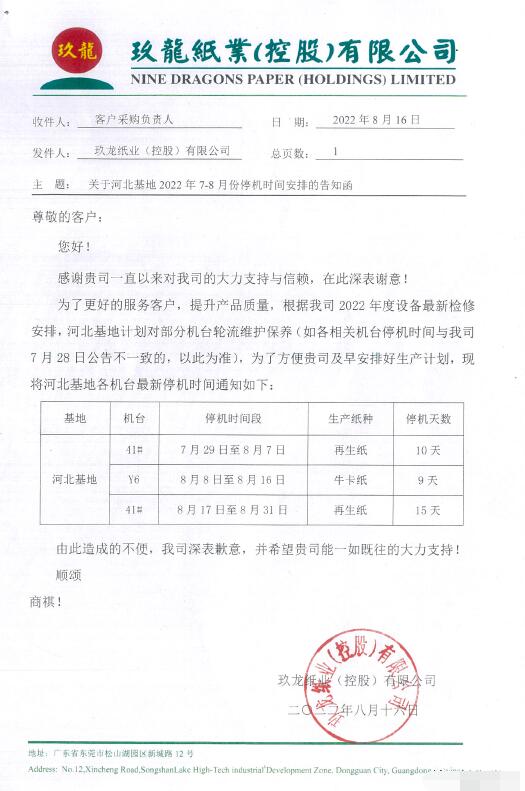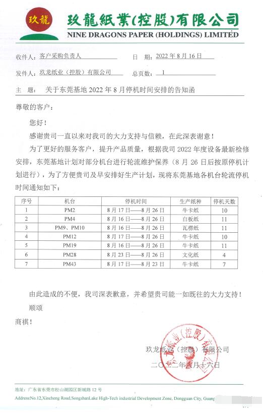 玖龍紙業(yè)再次發(fā)布停機(jī)函,東莞玖龍8臺紙機(jī)在8月16-26日期間輪停4-11天,預(yù)計減產(chǎn)箱板瓦楞紙、灰底白板紙和文化紙合計約8萬噸。