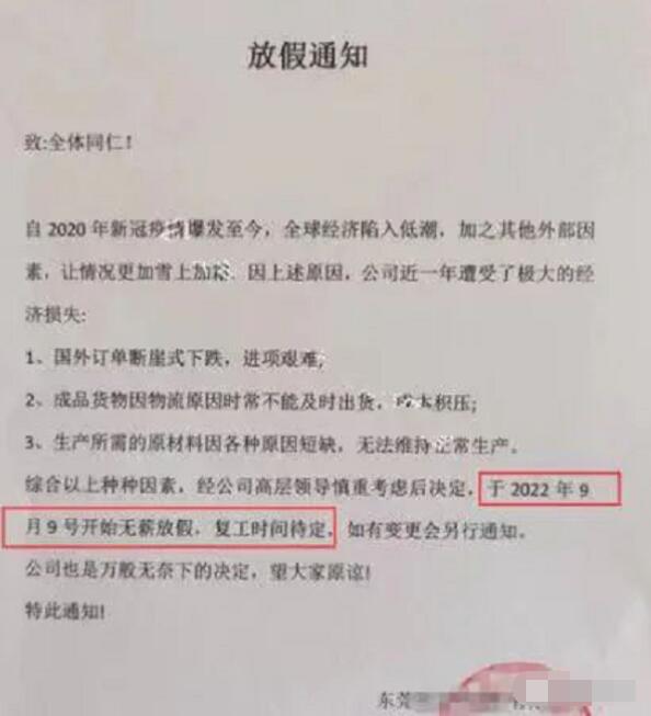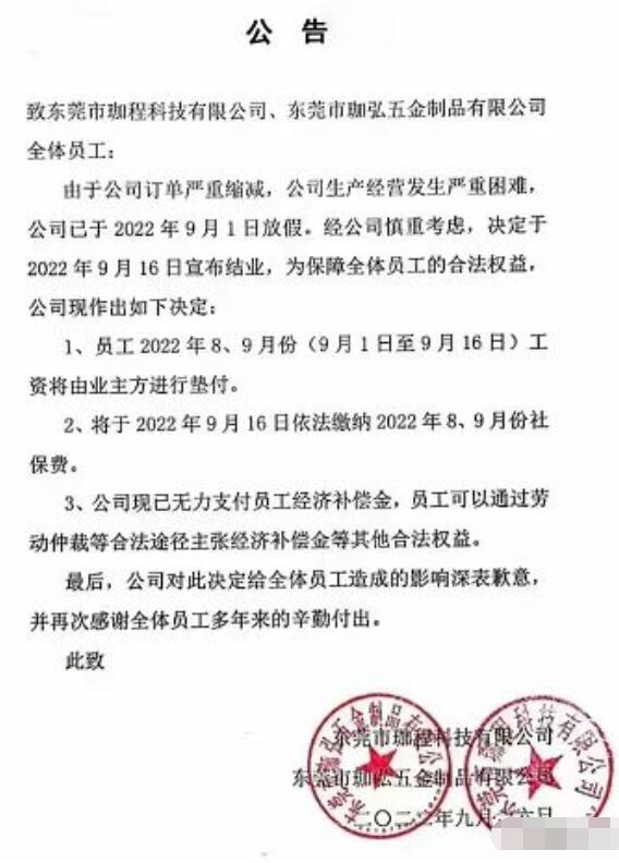 同樣是9月份,東莞另一家企業也發布公告,宣布從9月1日開始放假,9月16日正式結業。只是該企業卻直接表明“無力支付員工經濟補償金”,同時將矛頭指向房東,要求“八九月份的工資由業主方墊付”……