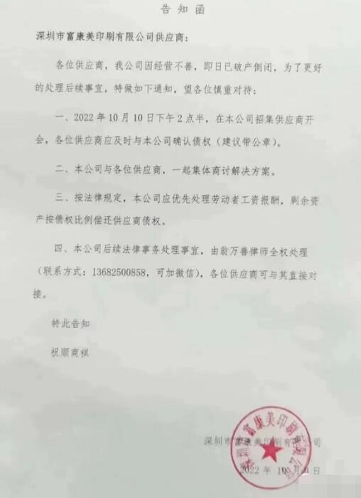 關于破產原因,深圳市富康美印刷有限公司只是籠統地解釋為“經營不善”,而在深圳另一家宣布破產清算的企業的聯絡函中,我們可以看到在當下復雜的宏觀環境中,中小型印刷包裝企業在面臨經營壓力時的艱辛與無奈。 10月8日,深圳市福興精品包裝有限公司向其供應商宣布,由于大環境的影響加上公司本身經營不善,造成了嚴重的資不抵債局面。據天眼查信息顯示,該公司成立于2020年11月份,產品包括禮盒、包裝盒、坑盒、畫冊、臺歷等,至今經營時間不到兩年。