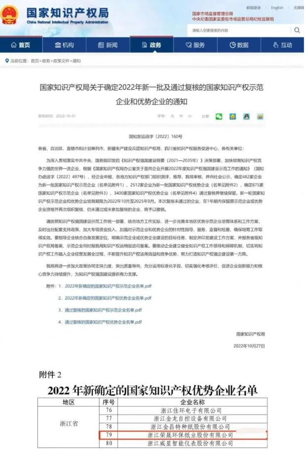 近日,國家知識產權局發布了《關于確定2022年新一批及通過復核的國家知識產權示范企業和優勢企業的通知》,榮晟環保憑借在知識產權創造、運用、管理、保護等方面的優勢,成功獲評“國家知識產權優勢企業”。這是繼今年8月入選“浙江省知識產權示范企業”后,對公司科技創新與知識產權工作的又一次肯定。