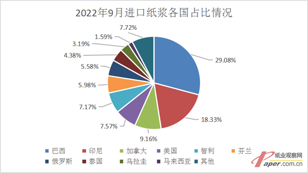 根據紙業觀察網統計,9月我國紙漿主要進口來源國分別為巴西、印尼、加拿大、美國、智利、芬蘭、俄羅斯、泰國、烏拉圭、馬來西亞等。其中,巴西占比穩居首位,為73.22萬噸,占比為29.28%;其次為印尼,為45.75萬噸,占比18.30%;再次為加拿大,為23.06萬噸,占比9.22%。