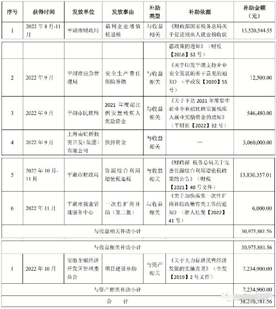 12月1日,浙江榮晟環保紙業股份有限公司(下文簡稱:榮晟環保)發布公告稱,自2022年8月24日至11月29日,公司及子公司累計收到政府補助38,210,781.56元(未經審計)。