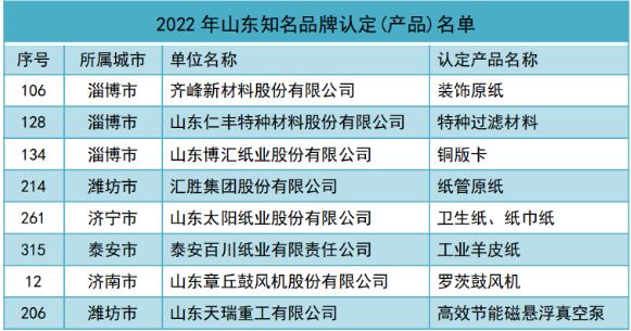 2022年12月23日,山東省品牌建設促進會發布了2022年山東知名品牌認定名單公告。根據《山東知名品牌認定管理辦法》的規定,遵循科學、客觀、公開、公平、公正、自愿、不收費的原則,經組織申報、資格審查、大數據挖掘、信息化系統平臺評審、專家評審等工作程序,認定488家單位的502個產品、97家單位的97個服務項目,獲得2022年山東知名品牌認定資格。其中8家造紙、裝備企業的主導產品被認定為山東知名品牌,包括: