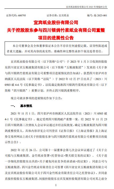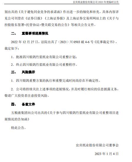 宜賓紙業(yè)于2023年1月3日收到控股股東五糧液集團(tuán)發(fā)來(lái)的《關(guān)于參與四川銀鴿竹漿紙業(yè)有限公司重整項(xiàng)目進(jìn)展情況的告知函》,獲悉四川省瀘州市納溪區(qū)人民法院于2022年12月27日出具了(2021)川0503破4-6號(hào)《民事裁定書(shū)》,法院裁定批準(zhǔn)四川銀鴿重整計(jì)劃,并終止四川銀鴿重整程序。