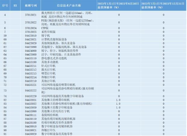 2023年1月,國務院關稅稅則委員會發布2023年關稅調整方案,宣布自2023年1月1日起,對部分進口商品的最惠國稅率、協定稅率和暫定稅率進行調整。 與2022年相比,2023年有關印刷設備器材的進口關稅有所調整。為方便解讀,下面將分幾個部分具體分析。 一、《部分信息技術產品最惠國稅率表》中稅率的調整 《部分信息技術產品最惠國稅率表》中共包含了上百款產品。其中,與印刷設備器材相關的調整主要包括印刷版材、印前設備、數字印刷設備,以及印刷零配件和輔助設備等產品,并且這些產品的關稅再次調整(見下表)。