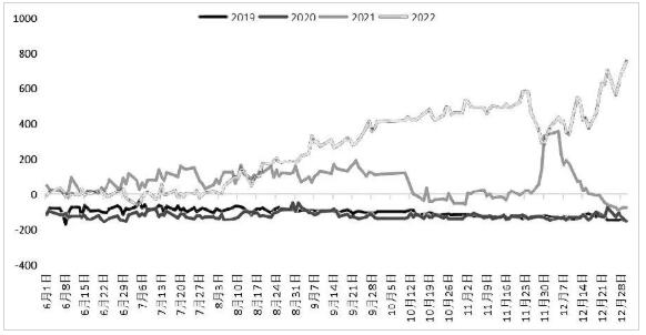 圖為紙漿期貨2301合約與2305合約價(jià)差(單位:元/噸) 綜合以上分析,供應(yīng)端改善預(yù)期有所加強(qiáng),但利空因素尚未兌現(xiàn),全球紙漿發(fā)運(yùn)量修復(fù)仍需時(shí)間,紙漿價(jià)格短期難以順暢下跌。從需求端來看,臨近春節(jié)假期,市場停機(jī)檢修情況有所增加,當(dāng)前行業(yè)利潤率同比大幅下降,紙制品價(jià)格進(jìn)一步走弱,紙企開工積極性不高,以降低產(chǎn)成品庫存為主,偏弱的需求也不支持紙漿價(jià)格繼續(xù)上漲。因此,短期紙漿遠(yuǎn)月合約或維持窄幅振蕩運(yùn)行,供應(yīng)端壓力預(yù)計(jì)在一季度末才能有所體現(xiàn)。