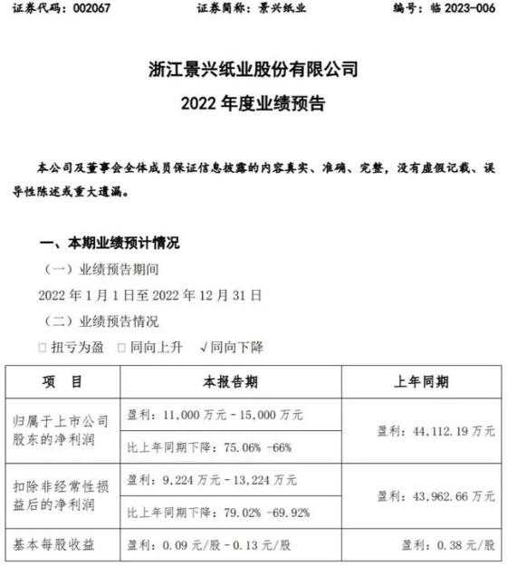 景興紙業(yè)(002067)近日發(fā)布2022年年度業(yè)績預告,報告期內(nèi)歸屬于上市公司股東的凈利潤11,000萬元-15,000萬元,比上年同期下降75.06%-66%;基本每股收益0.09元/股-0.13元/股。