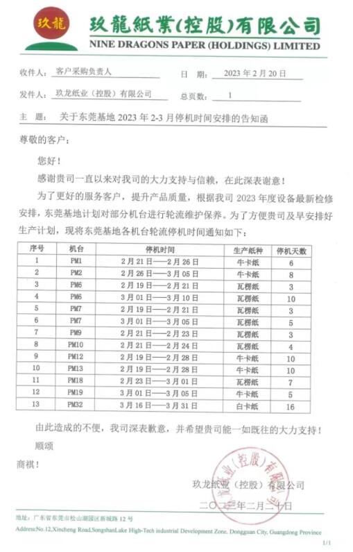 東莞玖龍紙業發布停機告知函,華東個別紙企宣布小漲50元/噸——平穩運行的包裝紙市場近日再起波瀾,能否成功走出低谷,實現價格轉向? 1、東莞玖龍11臺紙機輪流停機