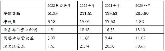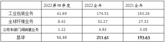 近日,美國國際紙業公布了其2022年財報,亮點如下: ●2022年國際紙業凈銷售額達到211.61億美元,相比2021年(194億美元)增長了9.3%;全年凈收益為15.04億美元; ●第四季度凈銷售額51.33億美元,凈收益為3.18億美元,旗下合資企業俄羅斯Ilim集團非現金減值5.33億美元; ●全年運營提供21.74億美元現金流,其中第四季度提供7.61億美元現金流; ●全年通過12.6億美元的股票回購和6.73億美元的股息向股東回報19.3億美元;其中第四季度向股東回報3.55億美元。 表1 國際紙業財報詳細數據對比(單位:億美元)