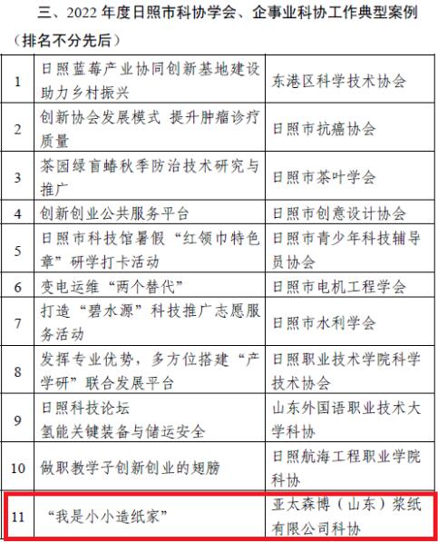 2月8日,日照市科學技術協會發布了《關于2022年度日照市科協學會工作和企事業科協工作情況的通報》,亞太森博(山東)漿紙有限公司科協被評為“2022年度日照市科協學會、企事業科協工作先進單位”,公司“我是小小造紙家”科普活動被評為“企事業科協工作典型案例”,公司科協委員楊恒被評為“企事業科協工作優秀工作者”。