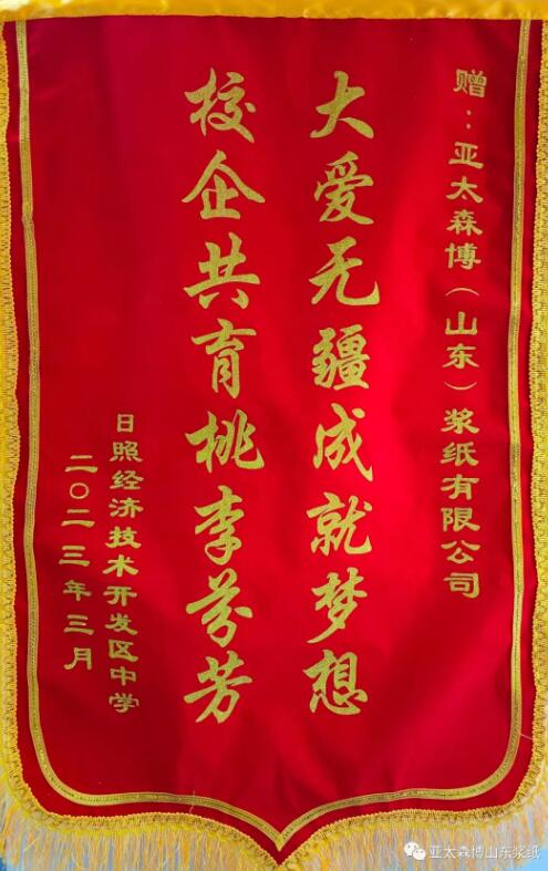 校長(zhǎng)李淑華在致辭中重點(diǎn)感謝了亞太森博對(duì)學(xué)校教育發(fā)展的支持。她說(shuō),作為友好鄰居,多年來(lái),亞太森博支持開發(fā)區(qū)中中學(xué)開展了教師培訓(xùn)、獎(jiǎng)學(xué)獎(jiǎng)教、運(yùn)動(dòng)會(huì)、學(xué)生研學(xué)等教育活動(dòng),全方位幫助學(xué)校提升教育教學(xué)水平,很好的助力了學(xué)校教育事業(yè)的發(fā)展。隨后,李校長(zhǎng)代表開發(fā)區(qū)中學(xué)為亞太森博贈(zèng)送了“大愛無(wú)疆成就夢(mèng)想,校企共育桃李芬芳”的錦旗表示感謝。
