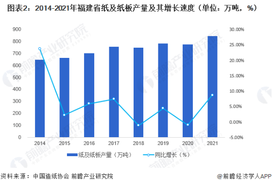 福建省紙制品包裝政策發(fā)展環(huán)境 2021年7月,福建省發(fā)布《福建省“十四五”制造業(yè)高質(zhì)量發(fā)展專項(xiàng)規(guī)劃》,規(guī)劃中明確突出特色化、流派化發(fā)展,著力推動福建傳統(tǒng)工藝振興,提升工藝美術(shù)、家裝日用品、造紙及紙制品等。到2025年,全省特色輕工產(chǎn)業(yè)規(guī)模達(dá)到5500億元。以泉州、漳州為重點(diǎn),打造紙及紙制品產(chǎn)業(yè)集群,引導(dǎo)恒安、玖龍、聯(lián)盛、青山紙業(yè)等企業(yè)加強(qiáng)自主創(chuàng)新能力建設(shè),提升設(shè)計(jì)集成能力和生產(chǎn)工藝技術(shù)裝備水平。重點(diǎn)提高生活用紙、包裝用紙及紙板、特種紙及紙板的產(chǎn)品質(zhì)量,優(yōu)化品種結(jié)構(gòu),研發(fā)制漿造紙纖維資源綜合利用和循環(huán)利用技術(shù),推動資源能源高效合理利用。 2021年福建省紙及紙板產(chǎn)量為845萬噸 根據(jù)中國造紙協(xié)會統(tǒng)計(jì)數(shù)據(jù)顯示,2014年以來,福建省紙及紙板產(chǎn)量穩(wěn)居全國前列。2014-2020年,福建省紙及紙板產(chǎn)量總體呈現(xiàn)波動增長變化趨勢。2021年,全省紙及紙板產(chǎn)量為845萬噸,相比上年增加8.75%。2021年福建省紙及紙板產(chǎn)量占全國紙及紙板總產(chǎn)量的比重為7.28%,排名第五。