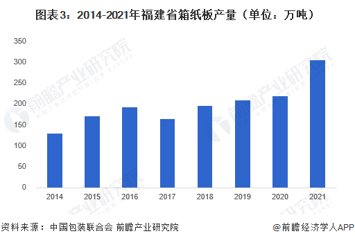 2021年福建省箱紙板產(chǎn)量為306.19萬噸 受益于上游造紙行業(yè)發(fā)展優(yōu)勢,福建省在紙制品包裝領(lǐng)域處于全國領(lǐng)先地位。根據(jù)中國包裝聯(lián)合會數(shù)據(jù)統(tǒng)計(jì),2014-2021年,福建省箱紙板產(chǎn)量總體呈現(xiàn)波動上升趨勢。2021年,福建省箱紙板產(chǎn)量達(dá)306.19萬噸,同比增長18.22%,為近年來新高。2021年福建省箱紙板產(chǎn)量占全國箱紙板總產(chǎn)量的18.22%,排名第一。