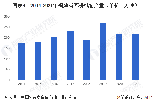 2021年福建省瓦楞紙箱產(chǎn)量為218.67萬噸 瓦楞紙箱方面,根據(jù)中國包裝聯(lián)合會數(shù)據(jù)統(tǒng)計(jì),2014年以來,福建省瓦楞紙箱產(chǎn)量呈現(xiàn)波動上升的態(tài)勢,2014年福建省瓦楞紙箱產(chǎn)量為175.8噸,到2021年,福建省瓦楞紙箱產(chǎn)量已達(dá)218.67萬噸。2020年福建省瓦楞紙箱產(chǎn)量占全國瓦楞紙箱總產(chǎn)量的6.35%,排名第六。