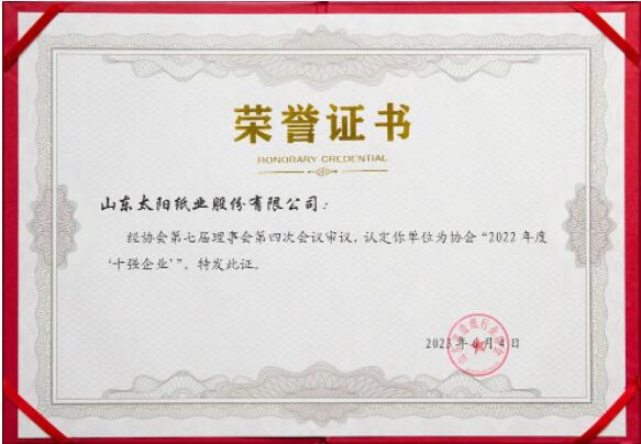 在頒獎環節,齊魯工業大學副校長、山東造紙學會理事長劉玉教授宣讀了《關于公布協會認定2022 年度“十強企業”的通報》,山東太陽紙業股份有限公司等十家企業被認定為山東省造紙行業協會“2022 年度‘十強企業’”。