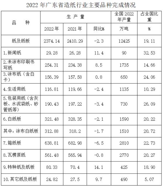 2022年,廣東省紙及紙板產量2374.14萬噸,同比下降2.3%;今年1-3月,全省紙及紙板產量541.62萬噸,同比下降3.7%,占全國16.9%。