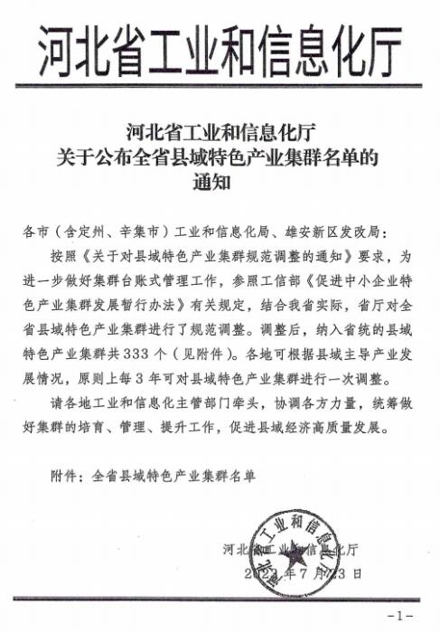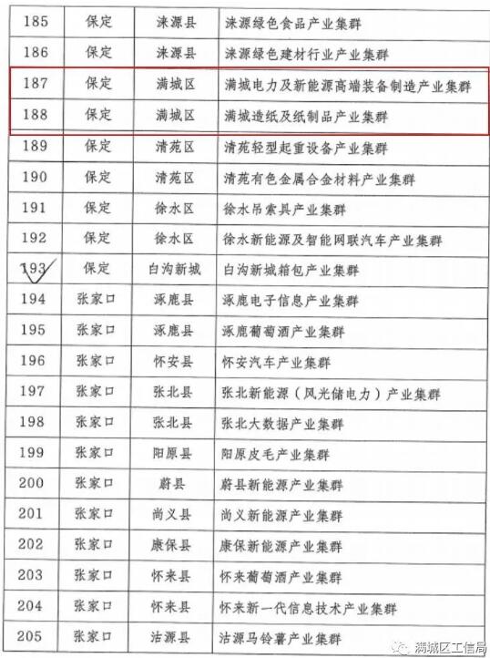 7月23日,河北省工信廳發布《關于公布全省縣域特色產業集群名單的通知》,“滿城造紙及紙制品產業集群”和“滿城電力及新能源高端裝備制造產業集群”成功入圍。