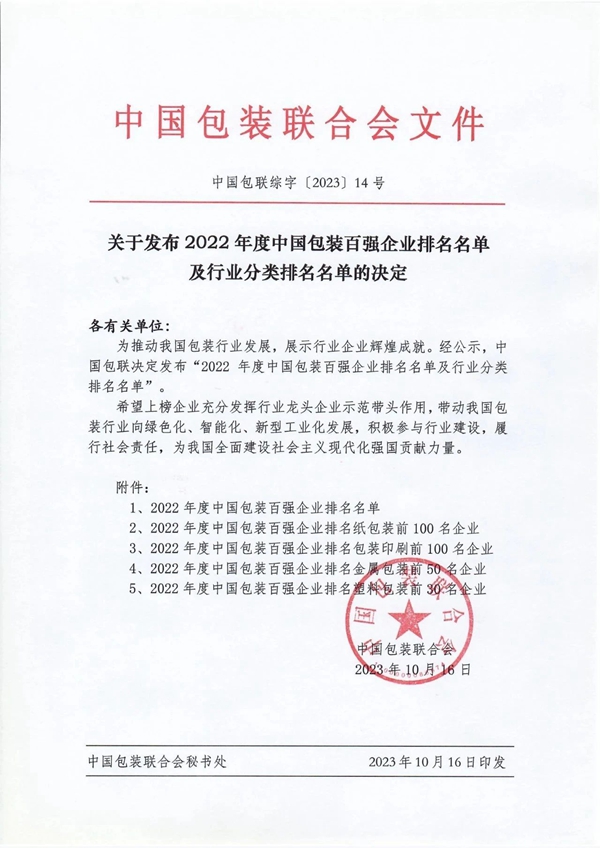 2023年10月16日,中國包裝聯合會正式公布了2022年度中國包裝百強企業排名名單和行業分類排名名單,深圳裕同、勝達集團和廈門合興列紙包裝百強企業的前三位。