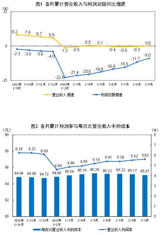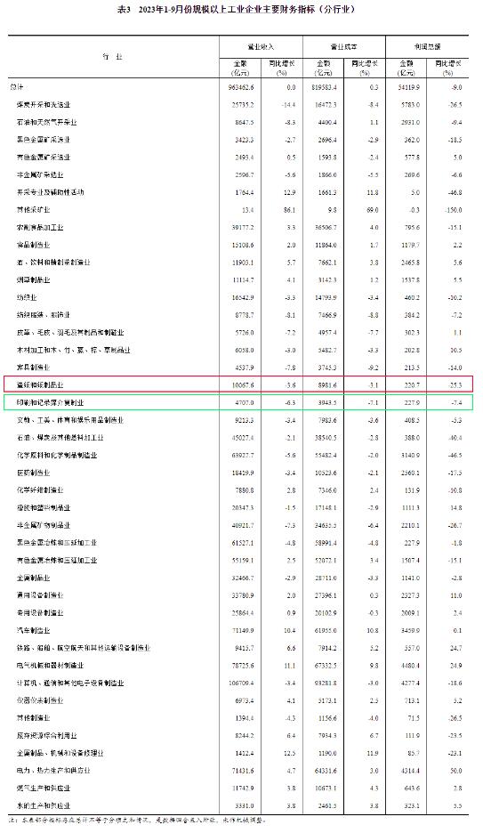 值得關(guān)注的是,造紙和紙制品業(yè)實現(xiàn)利潤總額220.7億元,同比下降25.3%;印刷和記錄媒介復(fù)制業(yè)實現(xiàn)利潤總額227.9億元,同比下降7.4%。 1—9月份,規(guī)模以上工業(yè)企業(yè)實現(xiàn)營業(yè)收入96.35萬億元,同比持平;發(fā)生營業(yè)成本81.96萬億元,增長0.3%;營業(yè)收入利潤率為5.62%,同比下降0.55個百分點。其中,造紙和紙制品業(yè)實現(xiàn)營業(yè)收入10067.6億元,同比下降3.6%;印刷和記錄媒介復(fù)制業(yè)實現(xiàn)營業(yè)收入4707.0億元,同比下降6.3%。 9月末,規(guī)模以上工業(yè)企業(yè)資產(chǎn)總計164.40萬億元,同比增長6.4%;負(fù)債合計94.63萬億元,增長6.7%;所有者權(quán)益合計69.77萬億元,增長6.0%;資產(chǎn)負(fù)債率為57.6%,同比上升0.2個百分點。 9月末,規(guī)模以上工業(yè)企業(yè)應(yīng)收賬款23.75萬億元,同比增長9.7%;產(chǎn)成品存貨6.13萬億元,增長3.1%。 1—9月份,規(guī)模以上工業(yè)企業(yè)每百元營業(yè)收入中的成本為85.07元,同比增加0.30元;每百元營業(yè)收入中的費用為8.34元,同比增加0.28元。 9月末,規(guī)模以上工業(yè)企業(yè)每百元資產(chǎn)實現(xiàn)的營業(yè)收入為80.1元,同比減少5.8元;人均營業(yè)收入為177.4萬元,同比增加6.0萬元;產(chǎn)成品存貨周轉(zhuǎn)天數(shù)為20.0天,同比增加1.2天;應(yīng)收賬款平均回收期為63.0天,同比增加5.9天。 9月份,規(guī)模以上工業(yè)企業(yè)實現(xiàn)利潤同比增長11.9%。 國家統(tǒng)計局工業(yè)司統(tǒng)計師于衛(wèi)寧解讀工業(yè)企業(yè)利潤數(shù)據(jù)表示,前三季度,隨著宏觀政策“組合拳”效果不斷顯現(xiàn),市場需求持續(xù)改善,工業(yè)生產(chǎn)平穩(wěn)增長,工業(yè)企業(yè)營收利潤持續(xù)恢復(fù)向好,企業(yè)效益狀況呈現(xiàn)以下主要特點:工業(yè)企業(yè)利潤逐季回升,當(dāng)季利潤由降轉(zhuǎn)增。企業(yè)當(dāng)季營收由降轉(zhuǎn)增,帶動利潤加快改善。三大門類利潤均有改善,六成行業(yè)利潤好轉(zhuǎn)。原材料制造業(yè)利潤降幅顯著收窄。消費品制造業(yè)利潤明顯好轉(zhuǎn)。不同類型企業(yè)利潤均有回升。企業(yè)單位成本下降,營業(yè)收入利潤率提高。總體看,前三季度工業(yè)企業(yè)利潤逐季改善,恢復(fù)向好態(tài)勢明顯。