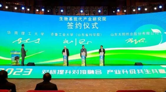 會上,山東省輕工產業鏈技術創新聯盟、綠色造紙生物基材料研發基地和造紙及出版印刷行業護眼聯盟進行了揭牌;兗州區人民政府與齊魯工業大學(山東省科學院)簽訂戰略合作協議;齊魯工業大學(山東省科學院)、華南理工大學與太陽紙業簽訂生物基現代產業研究院共建協議;華南理工大學與太陽控股簽訂制漿造紙綠色制造聯合實驗室共建協議;太陽控股與浙江鼎輝包裝科技有限公司、山東金葉新材料科技有限公司、山東潤聲印務有限公司、山東匯誠漿紙有限公司簽訂戰略合作協議。與會領導共同啟動山東省輕工產業鏈“一對標三對接”活動。