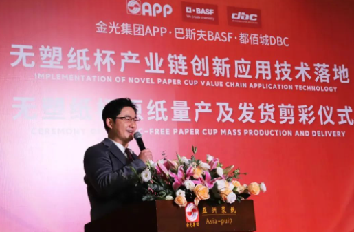 金光集團APP(中國)大紙事業部CEO王樂祥先生在剪彩儀式致辭,他高度評價了金光集團APP、巴斯夫BASF、都佰城DBC的技術營銷團隊在無塑紙杯產品開發過程中所做出的積極努力和成果。他相信,無塑紙杯將給食品包裝行業帶來革命性的改變,為人類的健康和地球的美好帶來更多的福音。王總在活動現場向行業終端和消費者發出了綠色倡議:“Joinus!Makeapositivechange.(加入我們,做出積極的改變!)”