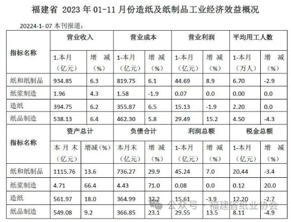 福建省2023年1-11月份造紙及紙制品工業(yè)經(jīng)濟效益概況